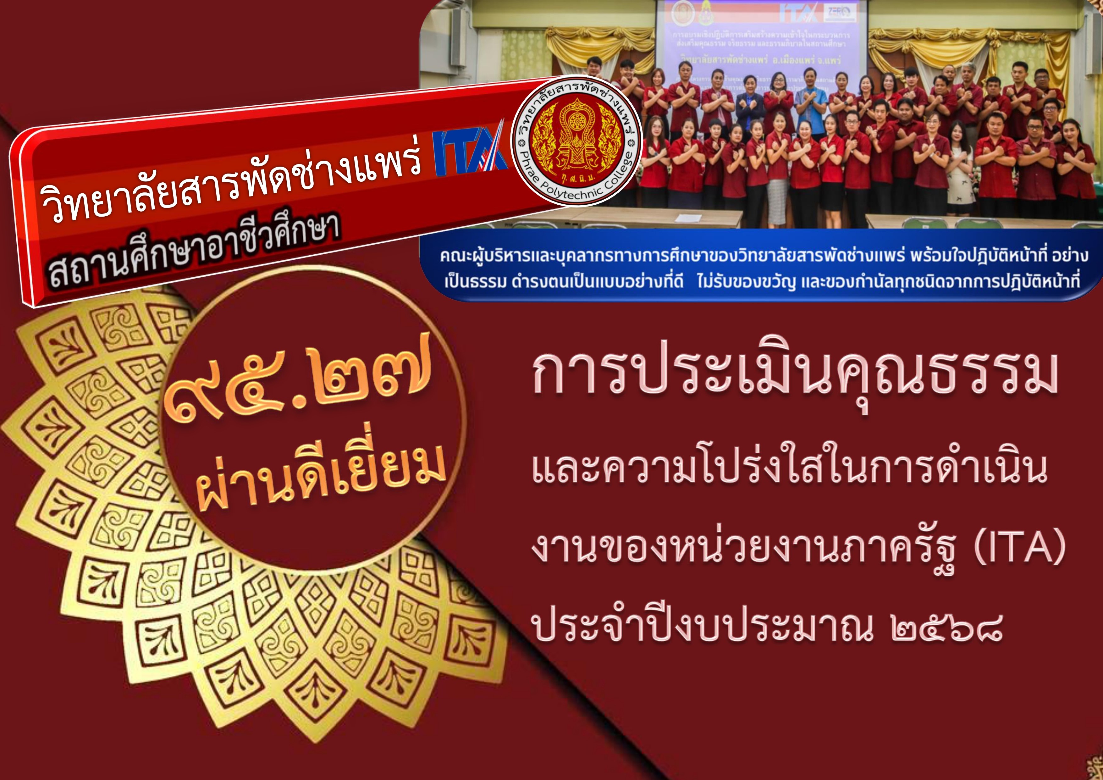 2 เดือน ที่ผ่านมาวิทยาลัยสารพัดช่างแพร่ นำโดย ดร.พุทธชาติ เกตุหิรัญ ผู้อำนวยการวิทยาลัยสารพัดช่างแพร่ พร้อมด้วยคณะผู้บริหาร คณะครู บุคลากรทางการศึกษา วิทยาลัยสารพัดช่างแพร่ เข้าร่วม โครงการสรุปผลการดำเนินงาน โครงการเสริมสร้างคุณธรรม จริยธรรม และธรรมาธิบาลในสถานศึกษา แผนงานบูรณาการต่อต้านการทุจริตและประพฤติมิชอบ ประจำปีงบประมาณ 2568 🗓ระหว่างวันที่ 16 -19 กันยายน 2568