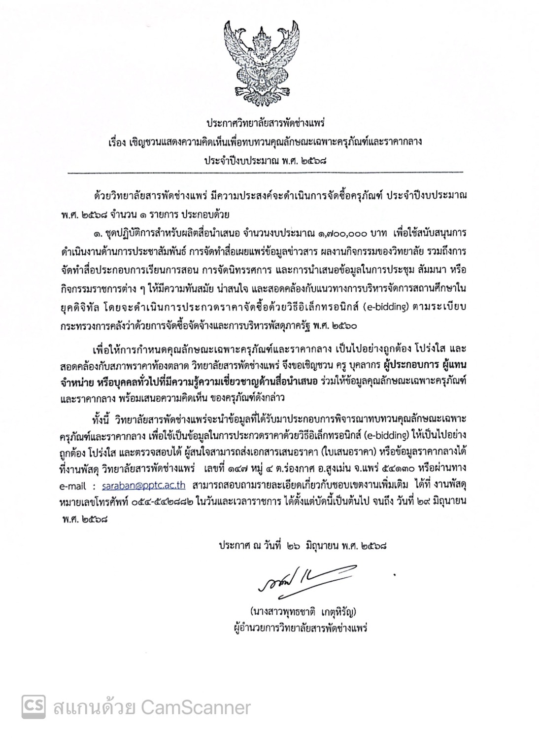 ประกาศเชิญชวนร่วมประชาพิจารณ์ (ร่าง)  รายละเอียดคุณลักษณะเฉพาะคุรุภัณฑ์  ชุดปฎิบัติการสื่อ  คลิก  อัพเดท 19/5/2568